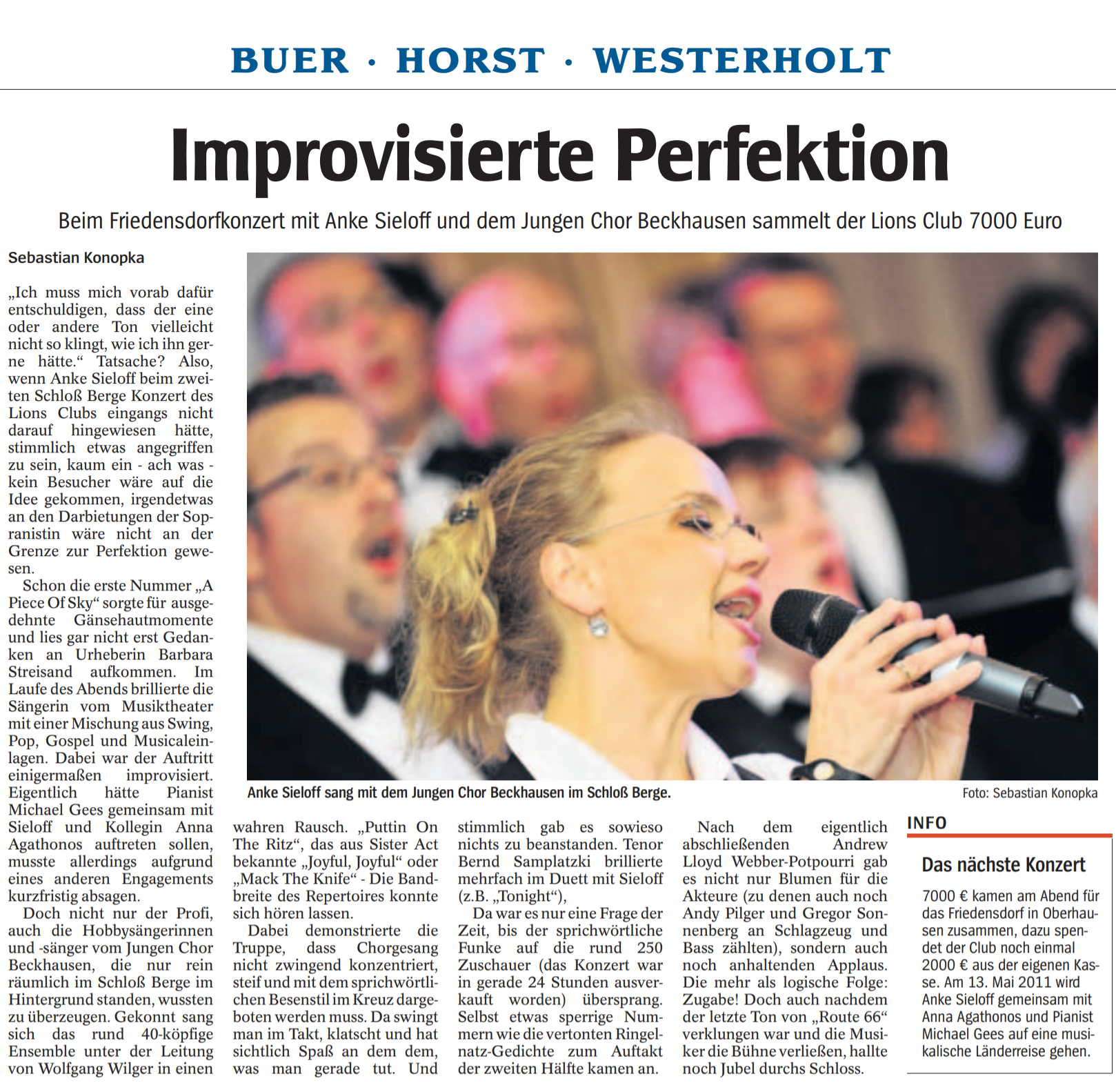 Nach dem großen Erfolg des Edith Piaf Abends im Frühjahr veranstaltet der Lions Club Gelsenkirchen-Buer sein 2. Schloss Berge-Konzert am 12. November 2010 um 19.30 Uhr im Graf-von-Limburg-Saal: Unter dem Motto „Oh Happy Day. Junger Chor trifft Anke Sieloff“ singt die Mezzosopranistin des MiR zusammen mit dem Jungen Chor Beckhausen unter der Leitung von Wolfgang Wilger Gospel, Musicalmelodien, Chansons und ein A.L.Webber Medley. Begleitet werden sie von Andy Pilger (Schlagzeug), Gregor Sonnenberg (Bass) und Wolfgang Wilger am Keyboard. Der Erlös geht wieder an das Friedensdorf in Oberhausen, das für die medizinische Betreuung schwerverletzter Kinder aus aller Welt sorgt. Schon bei vielen anderen Gelegenheiten haben Anke Sieloff, Wolfgang Wilger und der Junge Chor Beckhausen uneigennützig auf ihr Honorar zugunsten der vom Friedensdorf betreuten Kinder verzichtet. Auch der Lions Club Gelsenkirchen-Buer finanziert seit Jahren mit Spenden Flüge der Kinder aus ihren Heimatländern nach Deutschland. Eintritt im Vorverkauf: 15 €, erm. 12 € in der Buchhandlung Kottmann in Buer und bei Musik Gläsel in Gelsenkirchen-Altstadt.