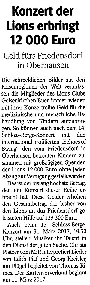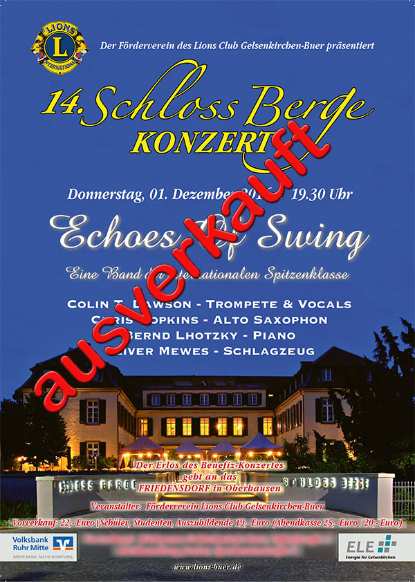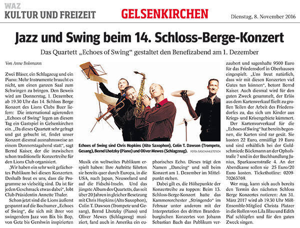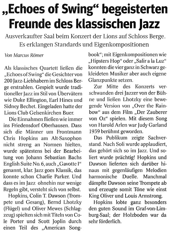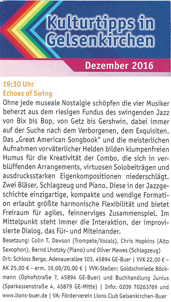 Das 14. Schloss Berge-Konzert bestritt am Donnerstag, den 01. Dezember 2016, um 19.30 Uhr die international auftretende Band. Colin T. Dawson - Trompete & Vocals Chris Hopkins - Alto Saxophon Bernd Lhotzky - Piano Oliver Mewes - Schlagzeug Ohne jede museale Nostalgie schöpften die vier Musiker beherzt aus dem riesigen Fundus des swingenden Jazz von Bix bis Bop, von Getz bis Gershwin, dabei immer auf der Suche nach dem Verborgenen, dem Exquisiten. Das 'Great American Songbook' und die meisterlichen Aufnahmen vorväterlicher Helden bildeten klumpenfreien Humus für die Kreativität der Combo, die sich in verblüffenden Arrangements, virtuosen Solobeiträgen und ausdrucksstarken Eigenkompositionen niederschlägt. Zwei Bläser, Schlagzeug und Piano. Diese in der Jazzgeschichte einzigartige, kompakte und wendige Formation erlaubt größte harmonische Flexibilität und bietet Freiraum für agiles, feinnerviges Zusammenspiel. Im Mittelpunkt steht immer die Interaktion, der improvisierte Dialog, das Für- und Miteinander. Die zeitgemäße Aufbereitung eines enorm abwechslungsreichen Repertoires und nicht zuletzt die humorvolle Moderation und spontane Bühnenpräsentation machten das Ensemble schon bald nach der Gründung zur gefeierten Attraktion namhafter Festivals und etablierten ECHOES OF SWING an der Spitze der internationalen Jazzszene. Ausgedehnte Tourneen führten die 'Echoes' quer durch Europa und die USA, nach Japan, Neuseeland und sogar auf die Fidschi-Inseln. Das im letzten Programmheft angekündigte Konzert „Christa Platzer trifft Lola Blau und Edith Piaf“ verschiebt sich aus Termingründen auf Freitag, den 31. März 2017.