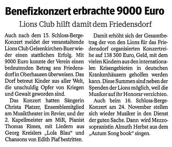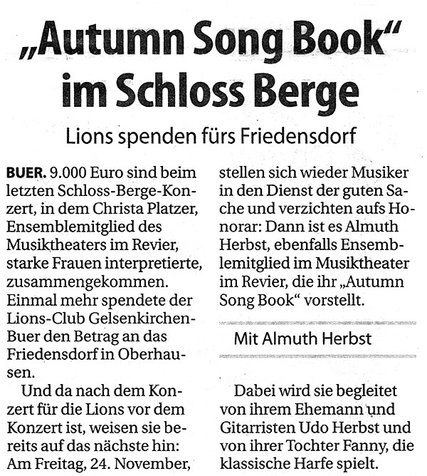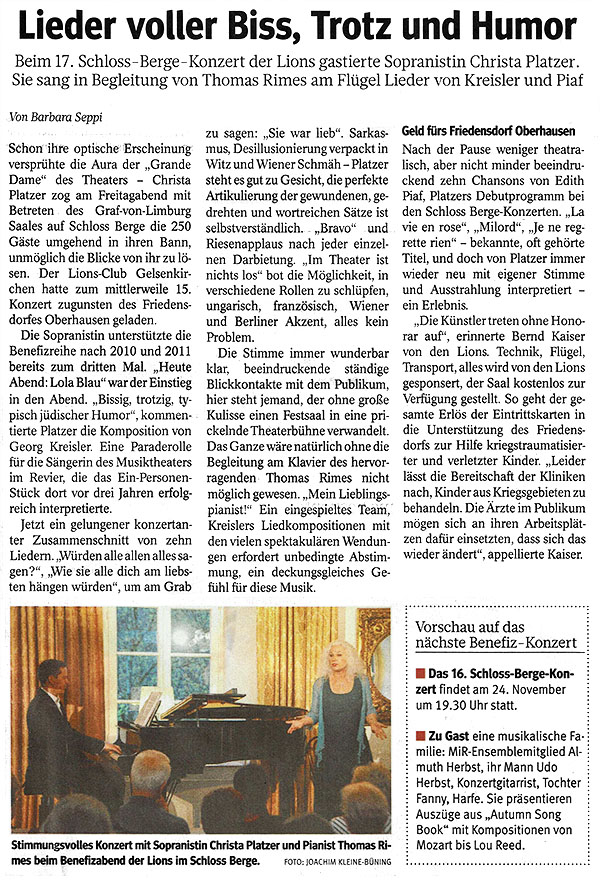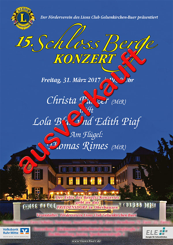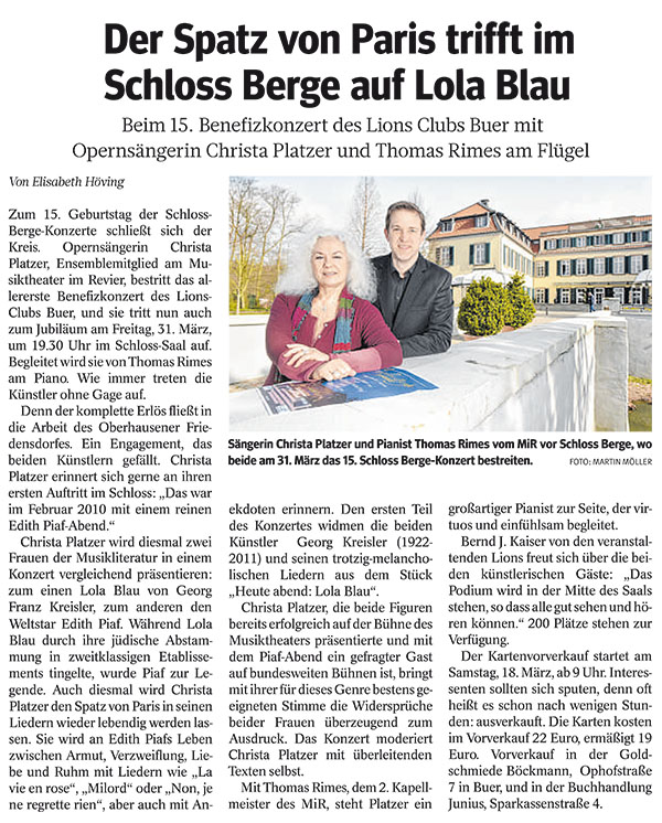 Beim 15. Schloss Berge-Konzert des Lions Clubs Gelsenkirchen am 31. März 2017 erwartete die Besucher ein Konzert, das Gelsenkirchen in dieser Form noch nicht erlebt hat. Christa Platzer, Ensemblemitglied am Musiktheater im Revier, präsentierte zwei Frauen der Musikliteratur in einem Konzert vergleichend: Lola Blau von Georg Franz Kreisler und Edith Piaf. Mit Lola Blau beschreibt Kreisler die eigene Lebensgeschichte und die seiner Frau Topsy Küppers. Er ist ein Wortakrobat, der bissig, hintergründig, tiefsinnig und poetisch die Gesellschaft unter die Sprach-Lupe nimmt, wie bereits die Besucher des 4. Schloss-Berge-Konzertes am 14.10.2011 unter dem Titel „Das gibt es nur in Gelsenkirchen“ bestens erfahren konnten. Musikalisch sehr unterschiedlich, haben beide Frauen etwas gemeinsam: völlig unpolitisch, verstrickten sie sich in den Fängen der Nazi-Diktatur. Ihre Karrieren begannen in den Wirren des 2. Weltkrieges. Während Lola Blau durch ihre jüdische Abstammung in zweitklassigen Etablissements tingelte, wurde Piaf zum Weltstar. Platzer hat zusammen mit ihrem Mann, dem Generalintendanten Michael Schulz, in einem gefeierten Piaf-Abend im Februar 2010 die Reihe der Schloss-Berge-Konzerte des Lions Clubs Gelsenkirchen-Buer begründet. Platzer bringt mit Ihrer für dieses Genre bestens geeigneten Stimme die Widersprüche, die sich bei beiden Damen zeigen, von Liebessehnsucht bis bitterem Scheitern einfühlsam zum Ausdruck. Das Konzert hat Christa Platzer mit überleitenden Texten selbst moderiert. Mit Thomas Rimes, dem 2. Kapellmeister des MiR, hatte Platzer einen großartigen Pianisten zur Seite, der virtuos und einfühlsam begleitet.