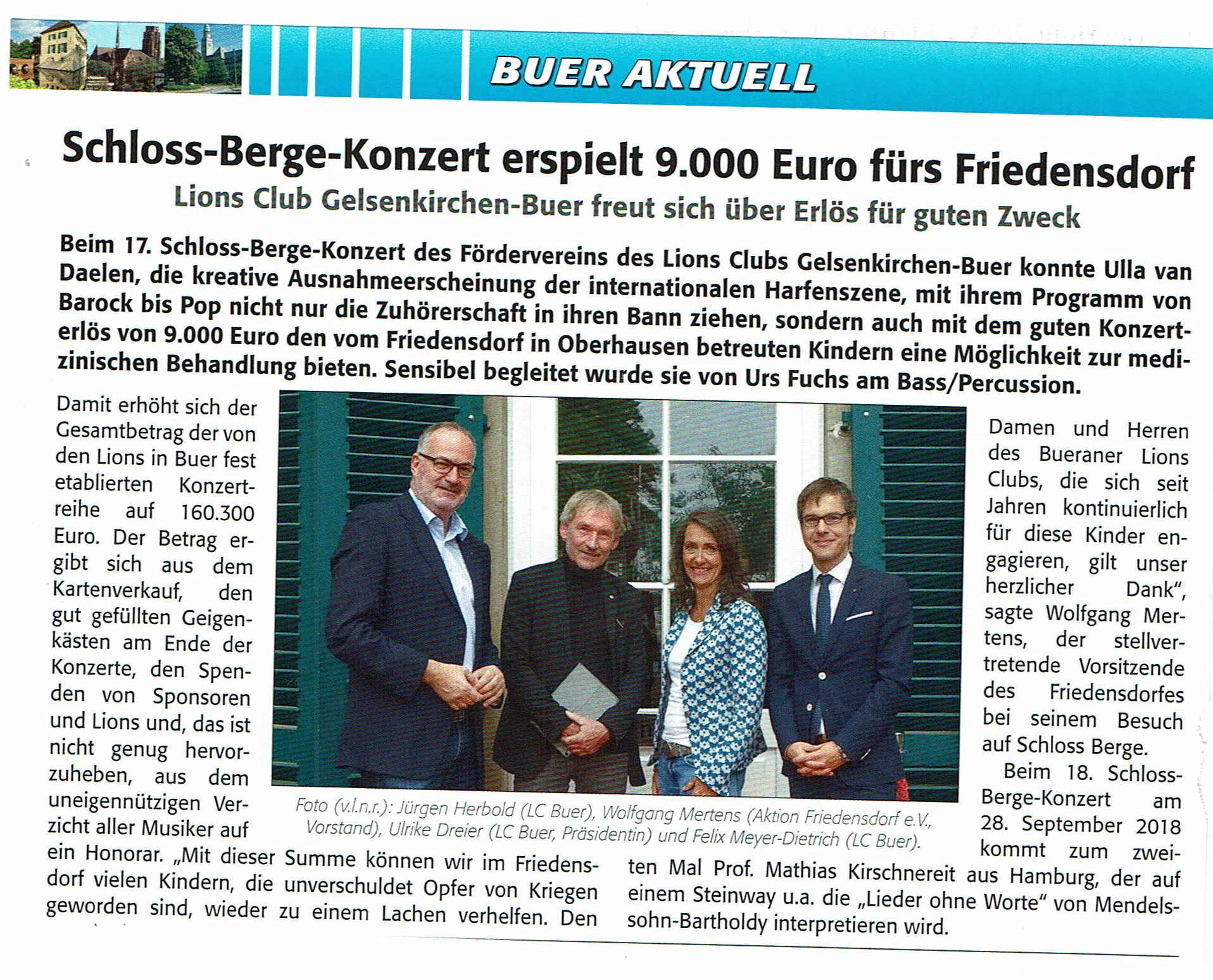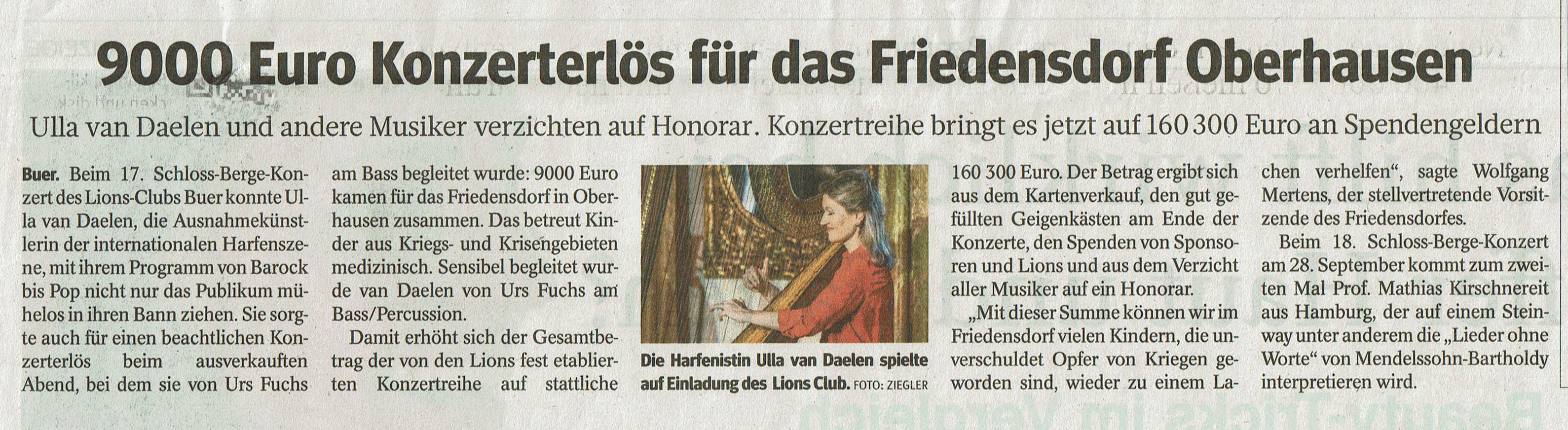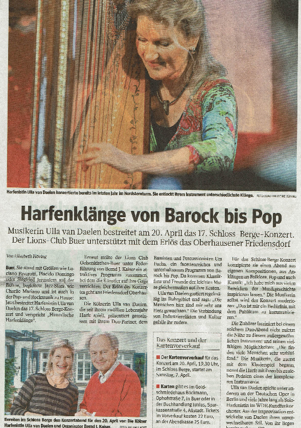 Beim 17. Schloss Berge-Konzert haben die begeisterten Zuschauer am 20. April 2018 mit Ulla van Daelen eine kreative Ausnahme-Musikerin der internationalen Harfenszene erlebt. Mit Witz, Charme und brillanter Virtuosität wandelte die mehrfache Preisträgerin und vormalige Solo-Harfenistin des WDR Rundfunkorchesters zwischen Klassik, Jazz, Weltmusik und Pop und verlieh der Harfe ein verblüffend neues Image. Sehr sensibel wurde sie von Urs Fuchs (Bass/Percussion) begleitet.