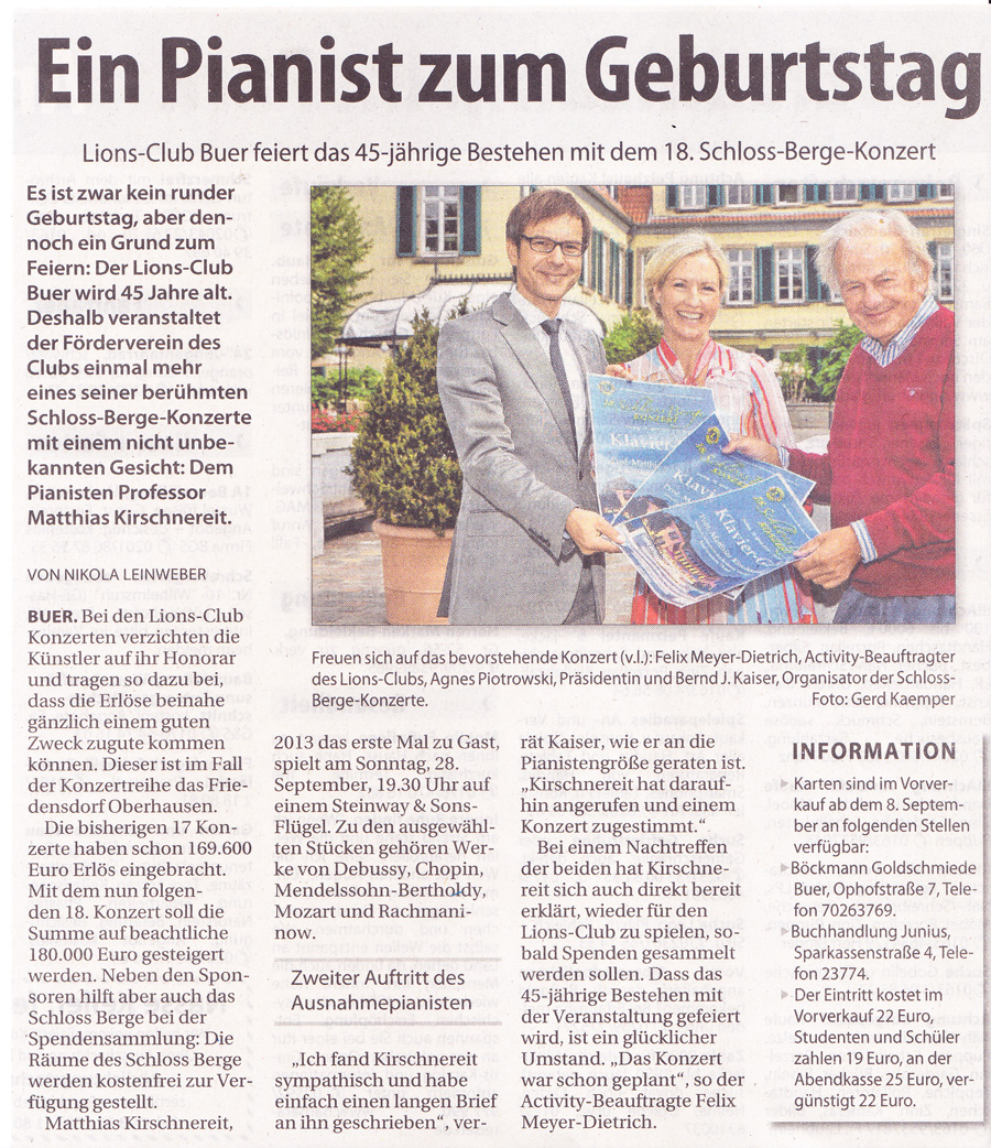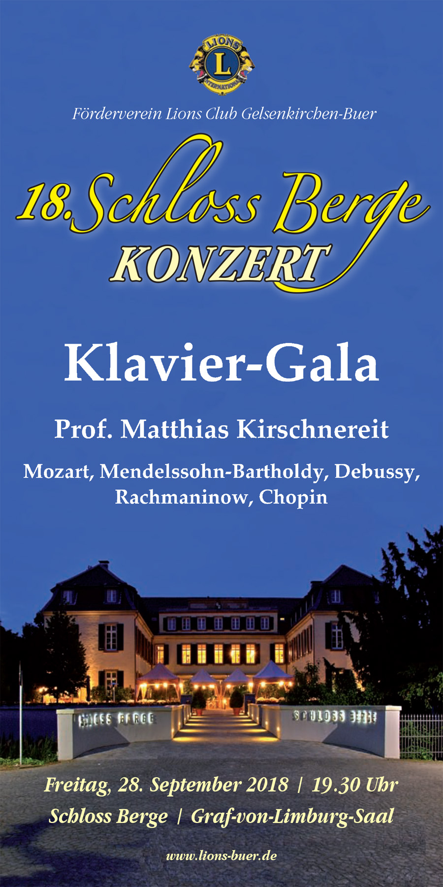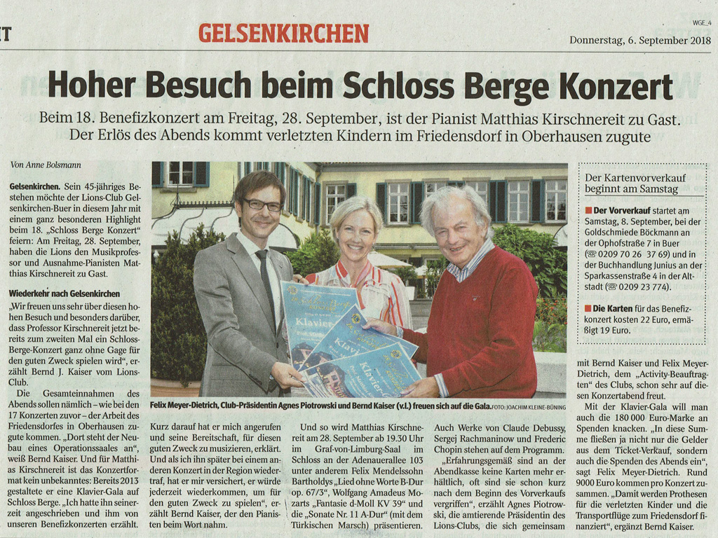 Unser 45-jähriges Bestehen im Jahr 2018 haben wir mit einem ganz besonderen Highlight gefeiert. Am 28. September 2018 gab der Musikprofessor und Ausnahme-Pianist Matthias Kirschnereit im Rahmen des 18. Schloss Berge-Konzerts auf einem Steinway-Flügel seine 2. Klavier-Gala in Gelsenkirchen-Buer. Kirschnereits musikalisches Programm bewegt sich hauptsächlich in der deutsch-österreichischen Romantik: Er wird unter anderem Felix Mendelssohn Bartholdys "Lied ohne Worte B-Dur op. 67/3", Wolfgang Amadeus Mozarts "Fantasie d-Moll KV 39" und die "Sonate Nr. 11 A-Dur" (mit dem Türkischen Marsch) präsentieren. Auch Werke von Claude Debussy, Sergej Rachmaninow und Frederic Chopin stehen auf dem Programm. Mit besonderer Anschlagskultur und hoher Sensibilität versteht es Kirschnereit, jedem Werk seine Besonderheit zu entlocken.
