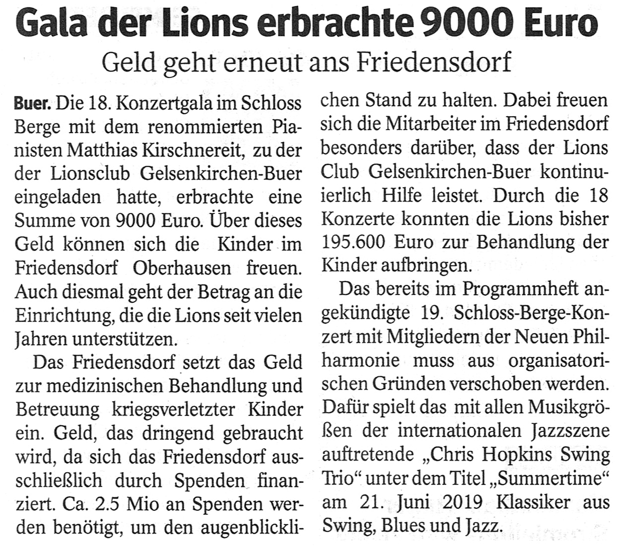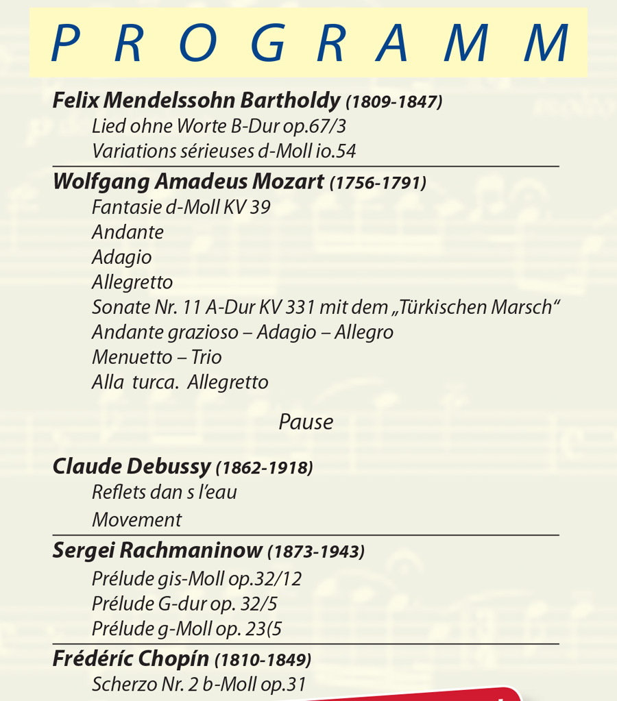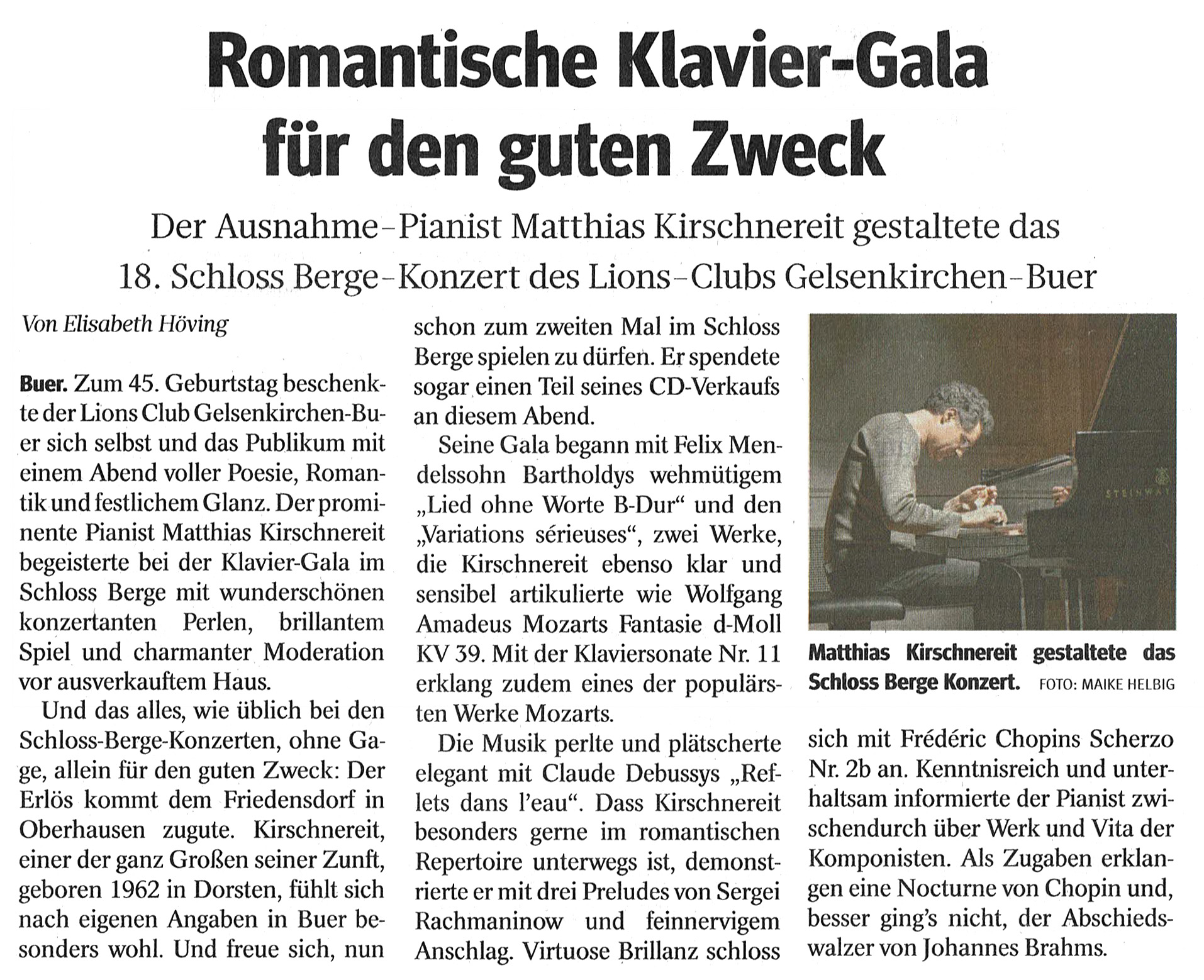 Unser 45-jähriges Bestehen im Jahr 2018 haben wir mit einem ganz besonderen Highlight gefeiert. Am 28. September 2018 gab der Musikprofessor und Ausnahme-Pianist Matthias Kirschnereit im Rahmen des 18. Schloss Berge-Konzerts auf einem Steinway-Flügel seine 2. Klavier-Gala in Gelsenkirchen-Buer. Kirschnereits musikalisches Programm bewegt sich hauptsächlich in der deutsch-österreichischen Romantik: Er wird unter anderem Felix Mendelssohn Bartholdys "Lied ohne Worte B-Dur op. 67/3", Wolfgang Amadeus Mozarts "Fantasie d-Moll KV 39" und die "Sonate Nr. 11 A-Dur" (mit dem Türkischen Marsch) präsentieren. Auch Werke von Claude Debussy, Sergej Rachmaninow und Frederic Chopin stehen auf dem Programm. Mit besonderer Anschlagskultur und hoher Sensibilität versteht es Kirschnereit, jedem Werk seine Besonderheit zu entlocken.