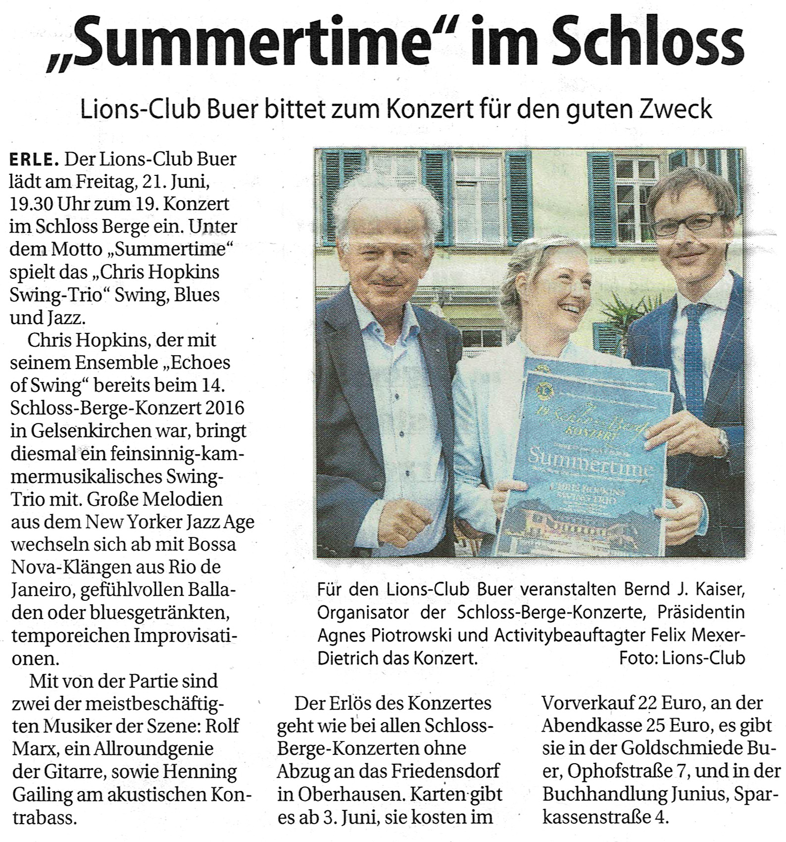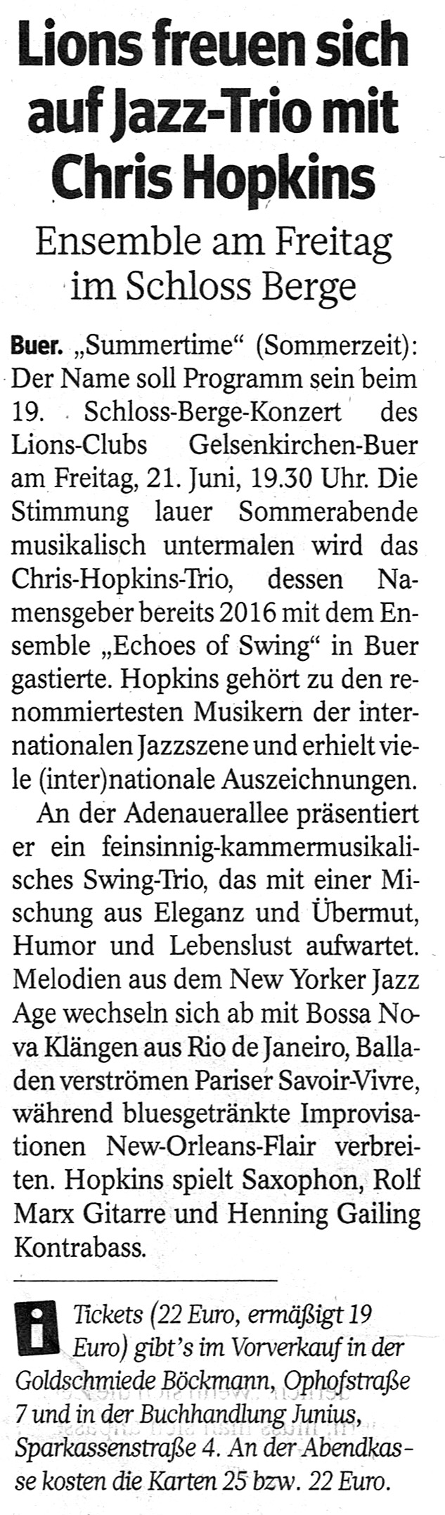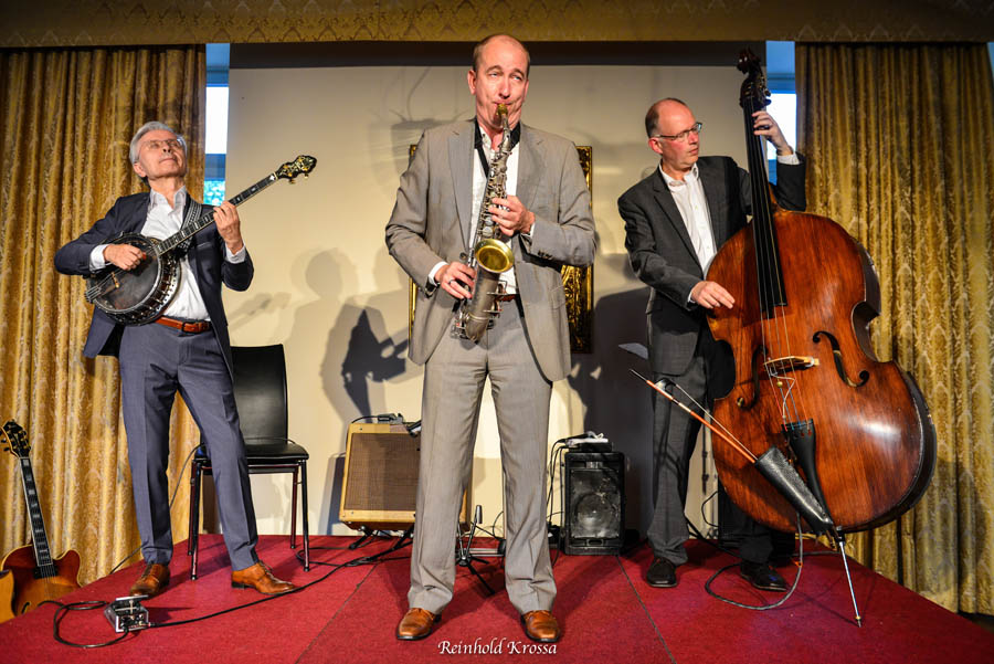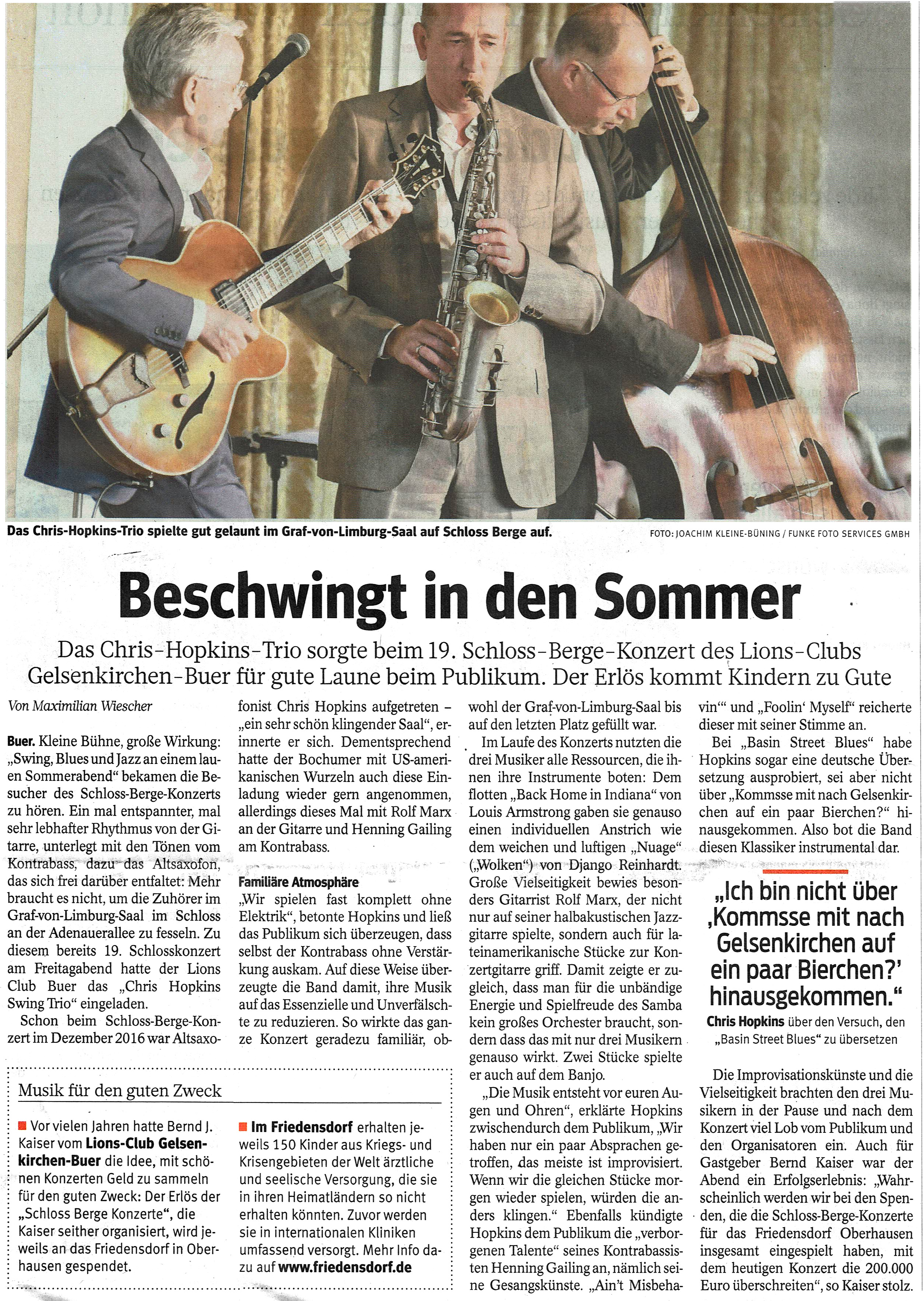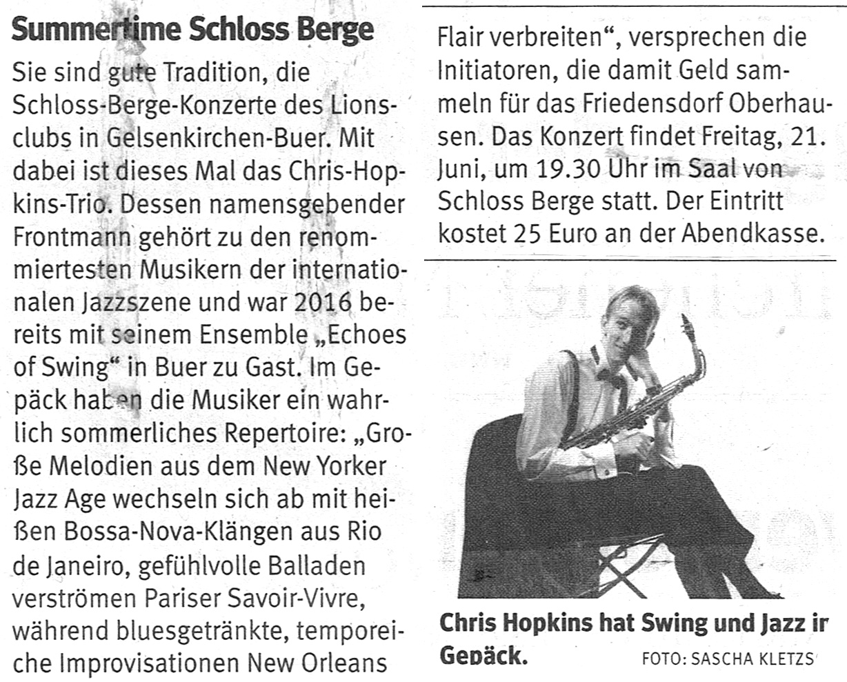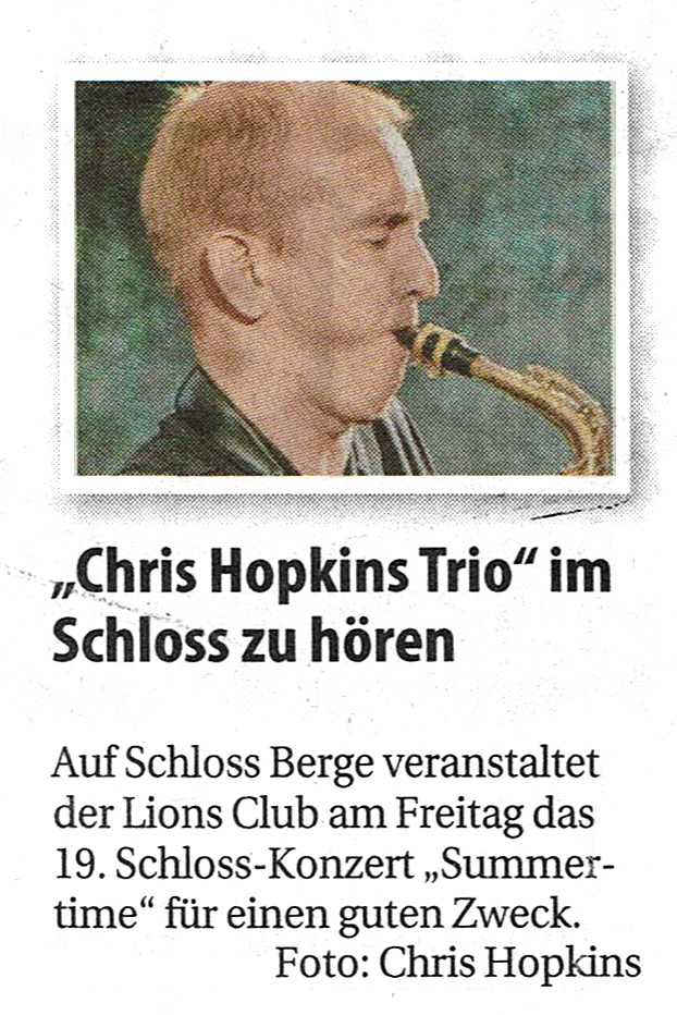 Für dieses außergewöhnliche Konzert präsentierte er ein feinsinnig-kammermusikalisches Swing-Trio, das mit einer Mischung aus Eleganz und Übermut, Humor und Lebenslust aufwartete. Große Melodien aus dem New Yorker Jazz Age wechselten sich ab mit heißen Bossa Nova Klängen aus Rio de Janeiro, gefühlvolle Balladen verströmten Pariser Savoir-Vivre, während bluesgetränkte, temporeiche Improvisationen New Orleans Flair verbreiteten. Mit von der Partie waren zwei der meistbeschäftigten Musiker der Szene: Rolf Marx, ein Allroundgenie der Gitarre, der alle Stilarten von der Klassik über Jazz bis hin zu Latin-Sounds beherrscht sowie Henning Gailing am akustischen Kontrabass, auf dessen Rhythmus- und Klang-Fundament man ein Haus bauen könnte. So spielten sich Chris Hopkins & Friends lustvoll durch einen besonderen Sommerabend und swingten was das Zeug hält. Lässig, mitreißend, unterhaltsam.