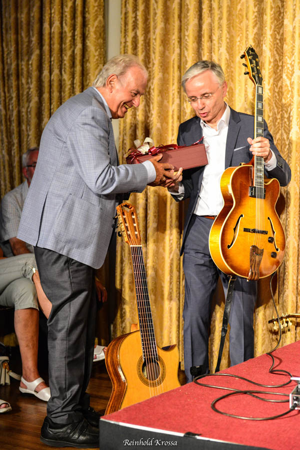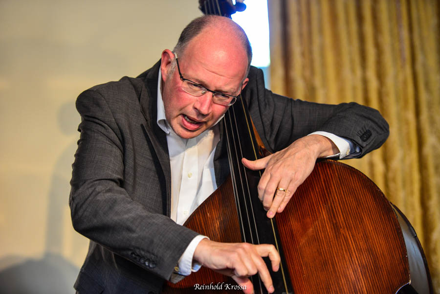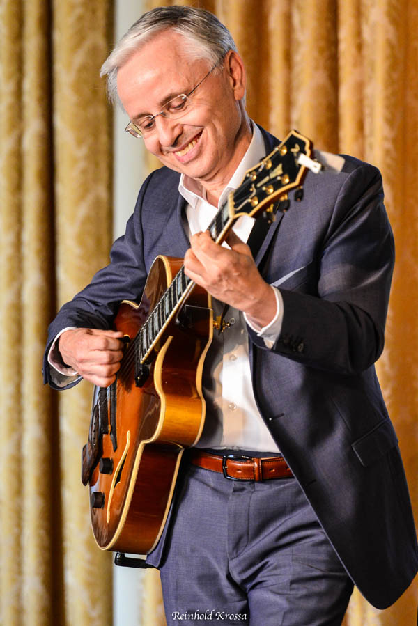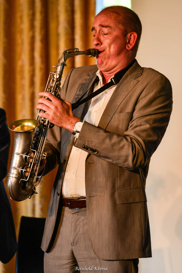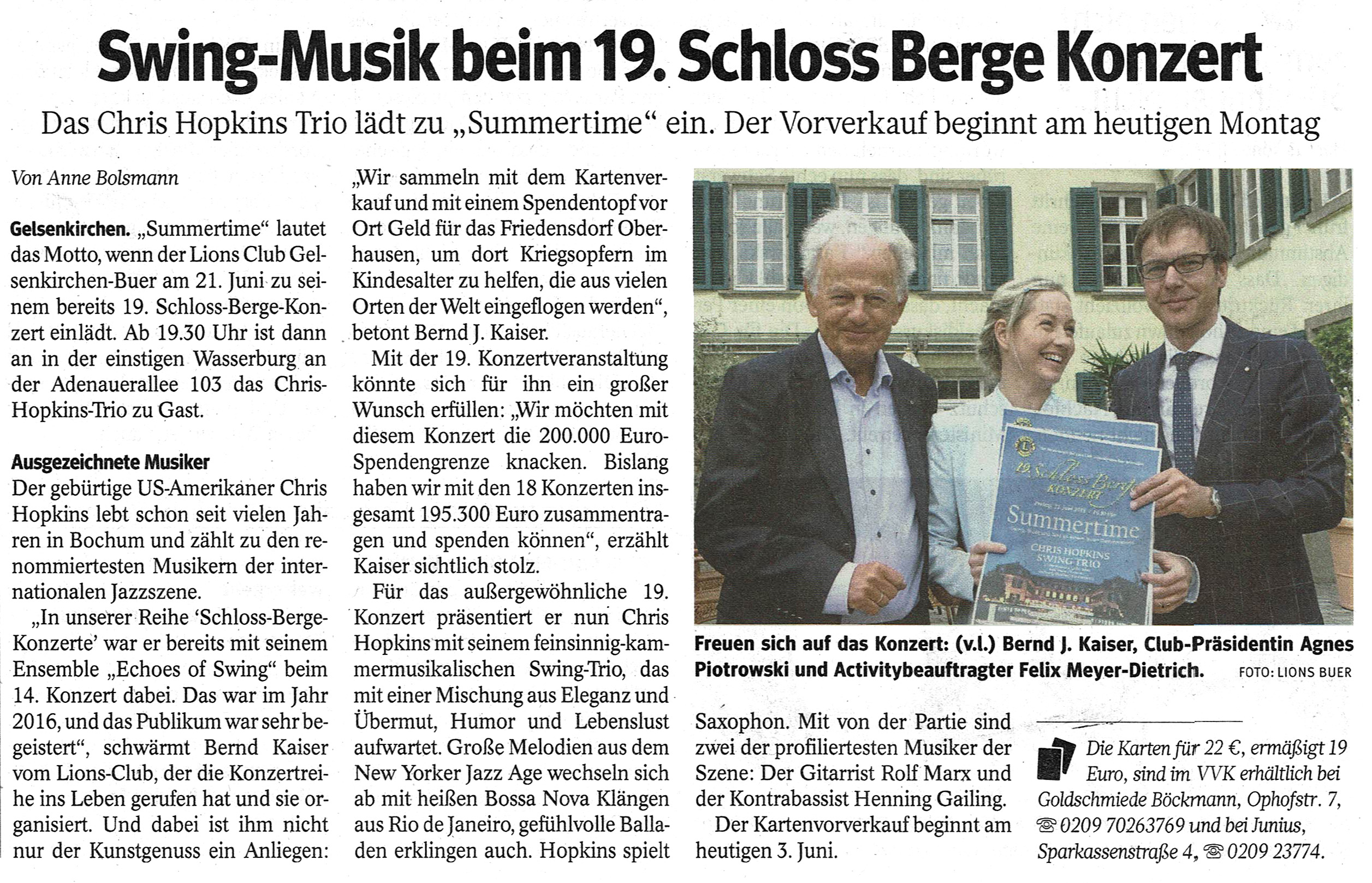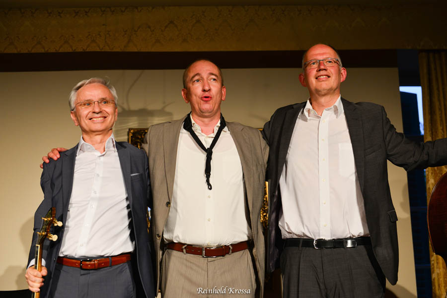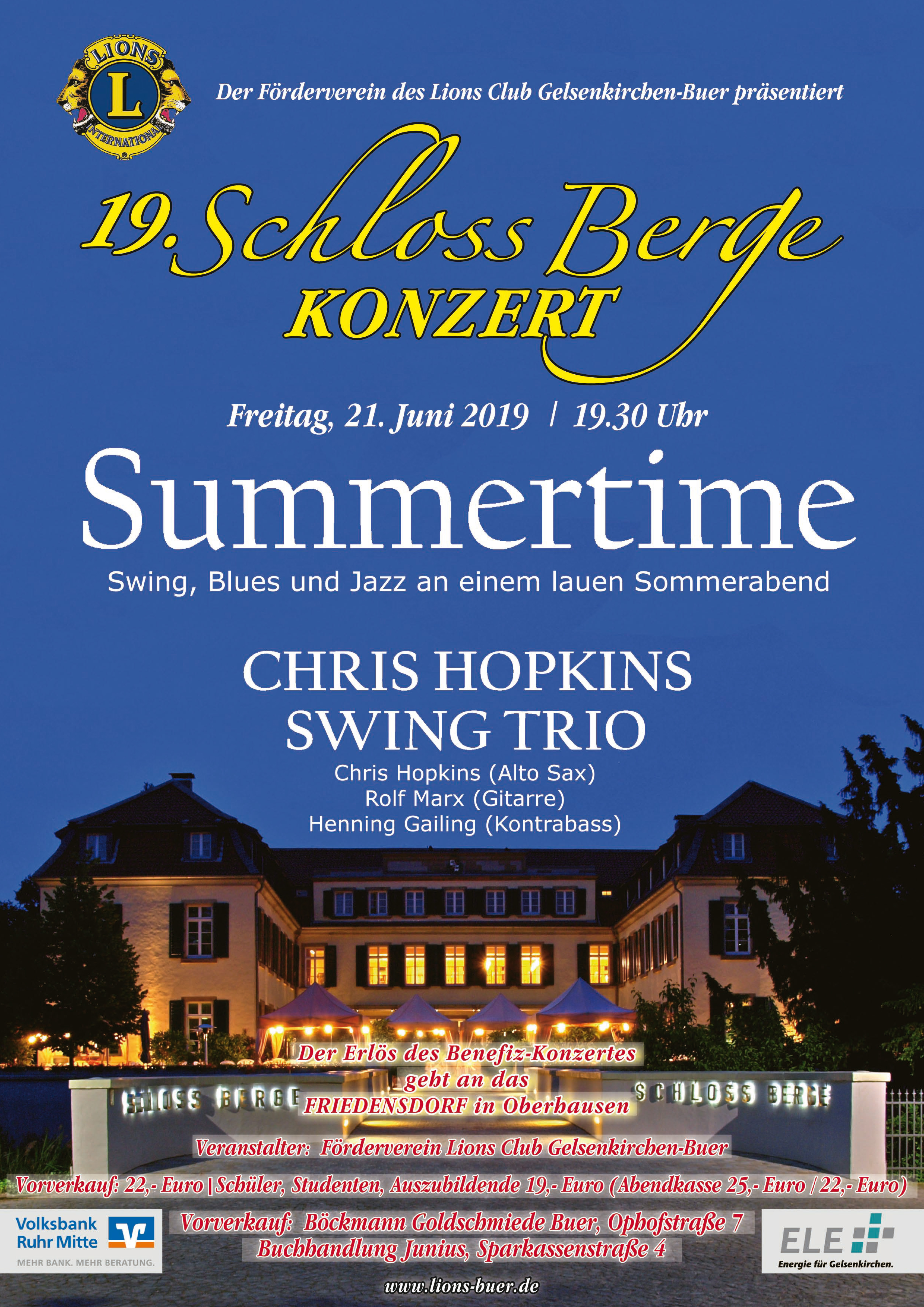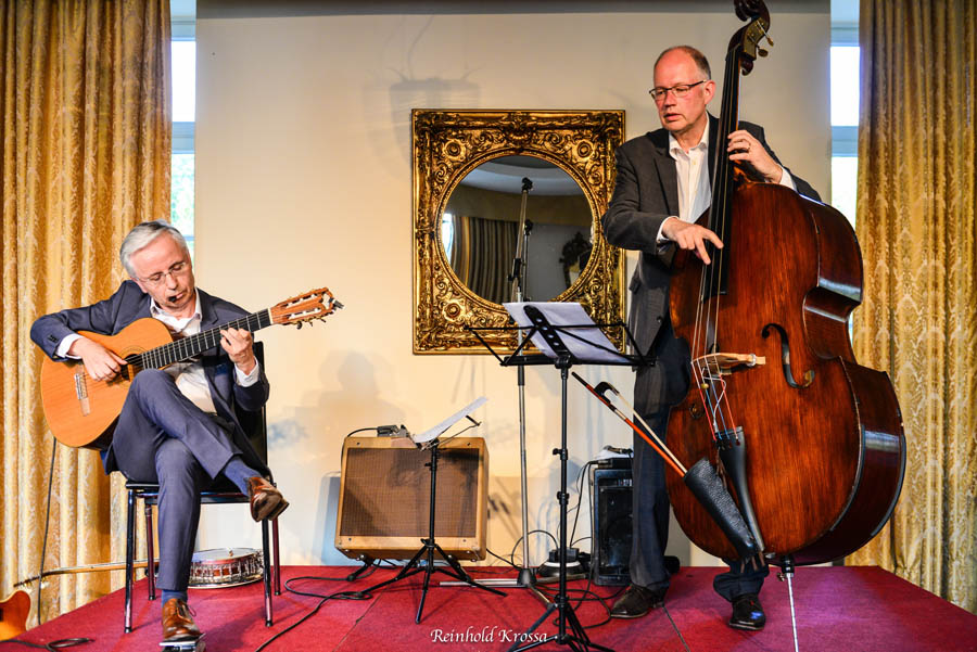 Für dieses außergewöhnliche Konzert präsentierte er ein feinsinnig-kammermusikalisches Swing-Trio, das mit einer Mischung aus Eleganz und Übermut, Humor und Lebenslust aufwartete. Große Melodien aus dem New Yorker Jazz Age wechselten sich ab mit heißen Bossa Nova Klängen aus Rio de Janeiro, gefühlvolle Balladen verströmten Pariser Savoir-Vivre, während bluesgetränkte, temporeiche Improvisationen New Orleans Flair verbreiteten. Mit von der Partie waren zwei der meistbeschäftigten Musiker der Szene: Rolf Marx, ein Allroundgenie der Gitarre, der alle Stilarten von der Klassik über Jazz bis hin zu Latin-Sounds beherrscht sowie Henning Gailing am akustischen Kontrabass, auf dessen Rhythmus- und Klang-Fundament man ein Haus bauen könnte. So spielten sich Chris Hopkins & Friends lustvoll durch einen besonderen Sommerabend und swingten was das Zeug hält. Lässig, mitreißend, unterhaltsam.