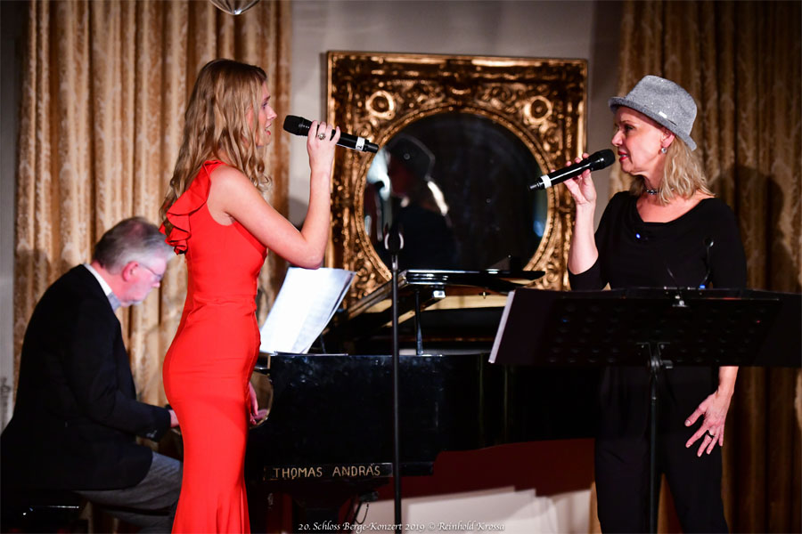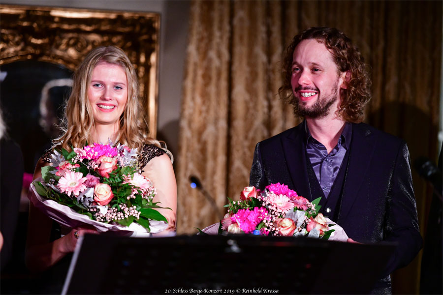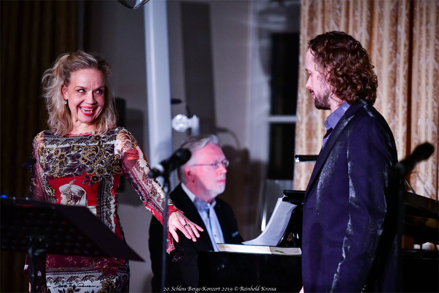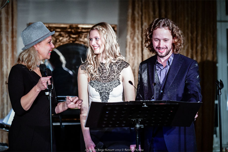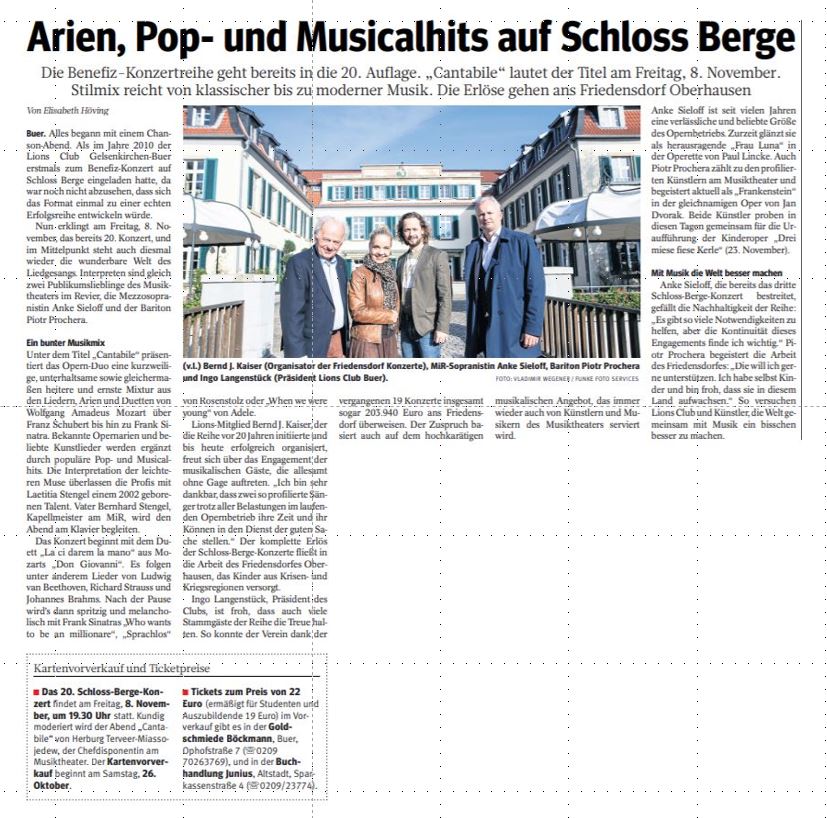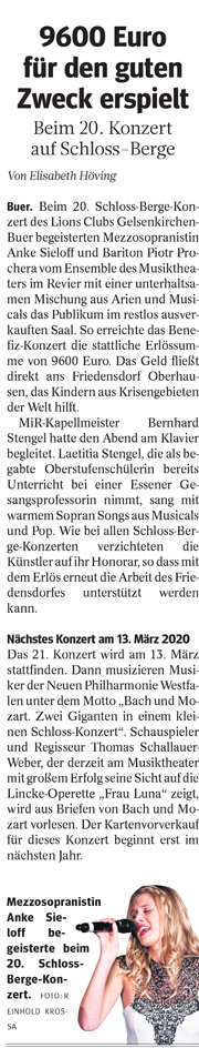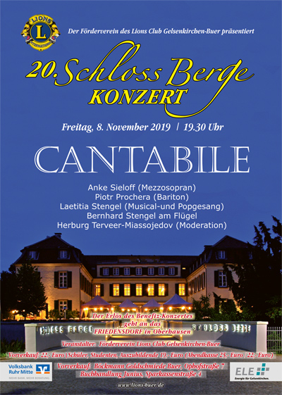 Beim 20. Schloss Berge Konzert am 8. November 2019 gab es wieder ein Hochfest derStimmen. Engagiert werden konnten mit Anke Sieloff (Mezzosopran) und Piotr Prochera (Bariton) zwei beliebte Solisten des Musiktheaters im Revier, die beide wegen besonderer Leistungen sowohl den Gelsenkirchener Theaterpreis als auch den Publikumspreis der Theatergemeinde erhalten haben. Verstärkt wurden sie durch das junge Talent von Laetitia Stengel, der Tochter von Bernhard Stengel, der am Flügel die musikalische Leitung des Abends übernahm. Damit förderten die Lions bewusst musikalische Nachwuchskräfte.