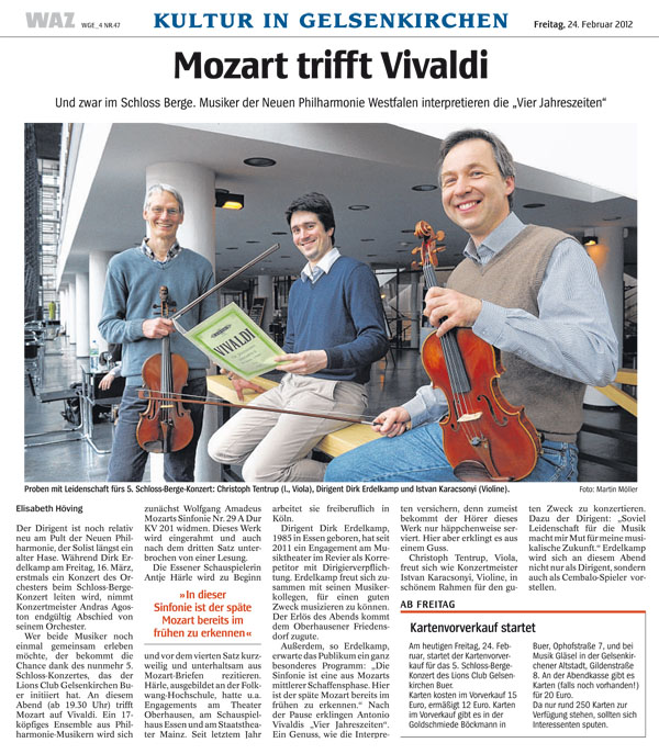 Dirk Erdelkamp, geboren 1985 in Essen, studierte Dirigieren und Korrepetition in Hannover und Wien. Als Assistent von Eiji Oue begleitete er mehrere Konzerttourneen in Asien und Europa mit verschiedenen Orchestern und übernahm die Einstudierung für "La Bohème" mit dem Sinfonieorchester Barcelona. Von 2009-2011 war er am Theater Trier engagiert und war neben seinen dortigen Nachdirigaten Leiter der Produktion von Bernsteins "Trouble in Tahiti", sowie mehrerer Kinderkonzerte. Außerdem wirkte er wiederholt als Assistent bei Radioaufnahmen der NDR Radiophilharmonie mit und dirigierte dort als Co-Dirigent von Alexander Liebreich die Uraufführung von Carsten Hennigs "Missa Tota". Im September 2010 leitete er als Gastdirigent das Kinderkonzert der NDR Radiophilharmonie. Darüber hinaus arbeitete Dirk Erdelkamp unter anderem mit der Philharmonie Wroclaw, dem Emsländischen Kammerorchester und dem Symphonieorchester Hannover zusammen. Seit August 2011 ist er am Musiktheater im Revier als Korrepetitor mit Dirigierverpflichtung engagiert.
