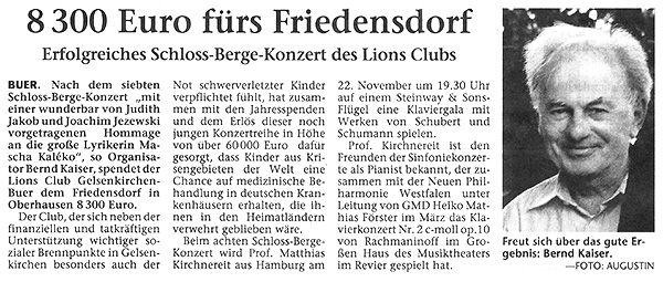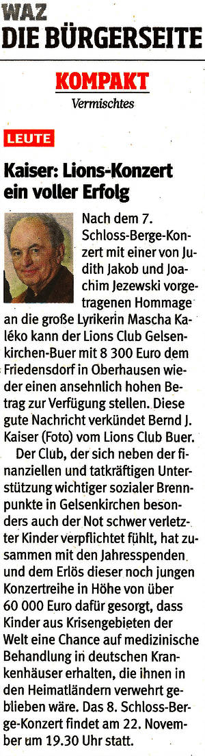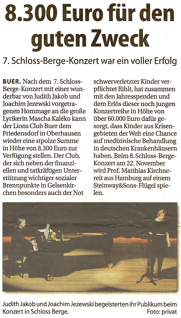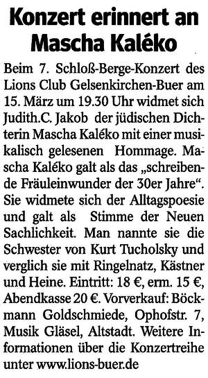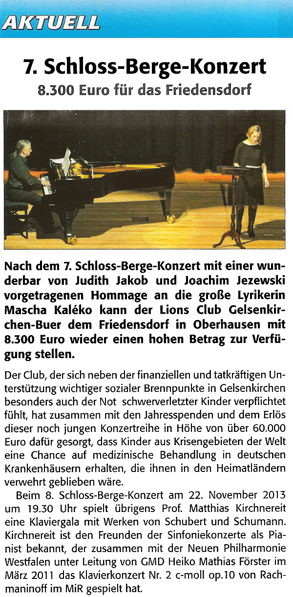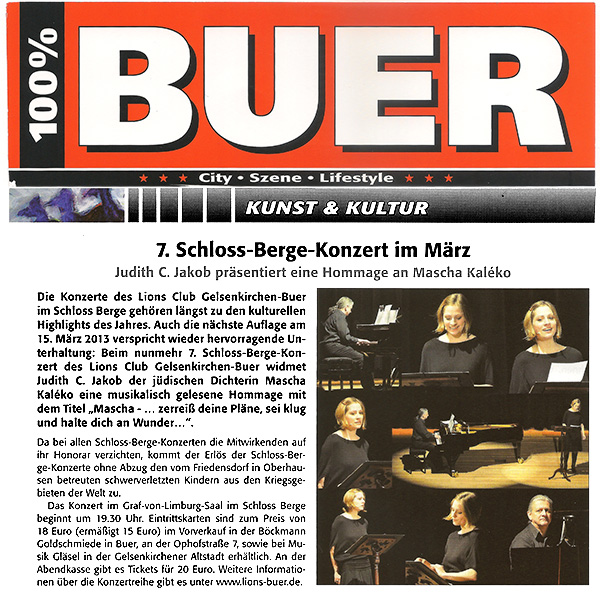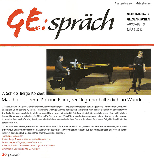 Beim 7. Schloss-Berge-Konzert am 15. März 2013 gestaltete die Sängerin Judith Jacob, ehemaliges Ensemblemitglied im Musiktheater im Revier, eine musikalische Lesung mit Texten und Gedichten von Mascha Kaléko, der jüdischen Autorin, die nach einem Auftrittsverbot durch die Nationalsozialisten ausgewandert war, in ihrem Herzen jedoch immer in Berlin blieb. Begleitet wurde sie am Flügel durch Joachim M. Jazewski.
