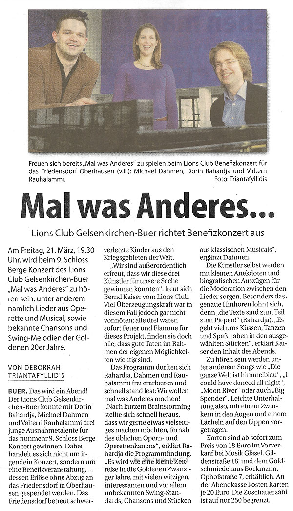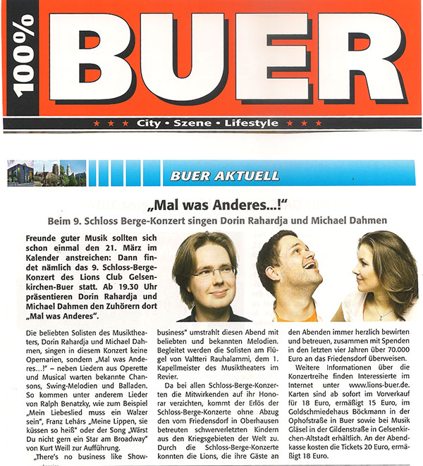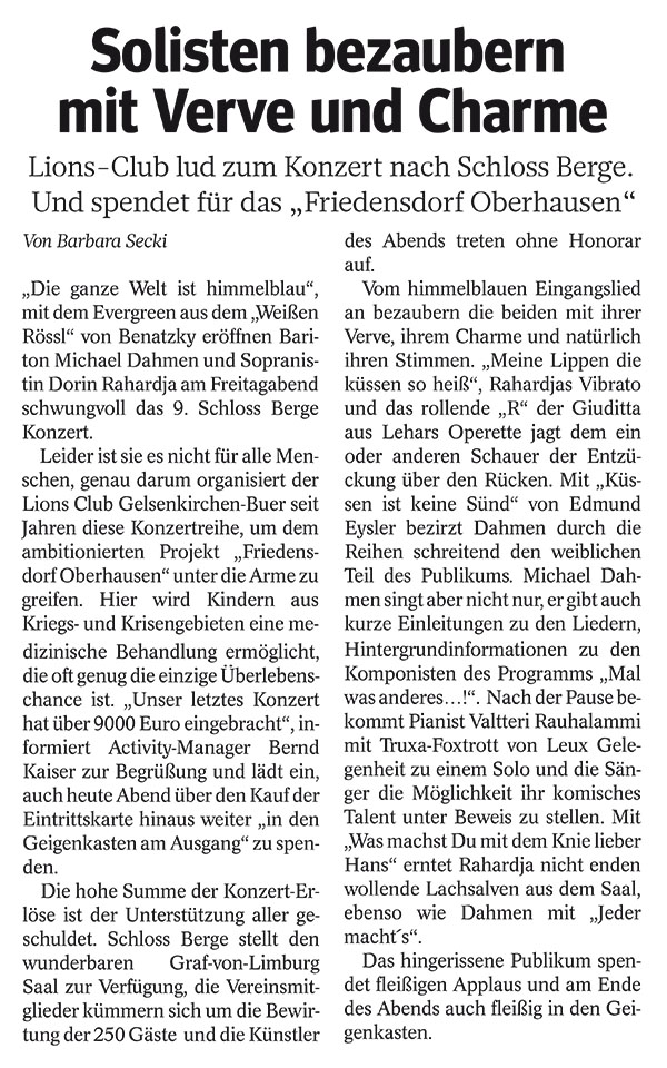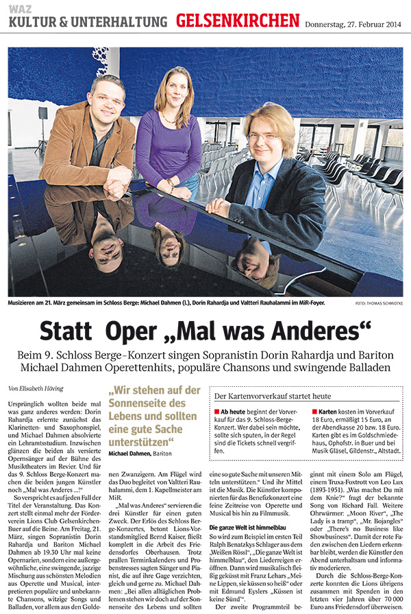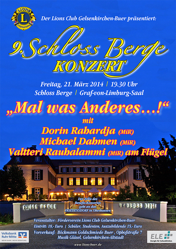 Beim 9. Schloss-Berge-Konzert des Lions Club Gelsenkirchen-Buer haben Dorin Rahardja (MiR) und Michael Dahmen (MiR) im Mai 2014 einen bunten Frühlingsstrauß beliebter Melodien aus den Bereichen Operette, Musical und Chanson für Sie gepflückt. Sie wurden am Flügel von dem finnischen Pianisten Valtteri Rauhalammi begleitet.