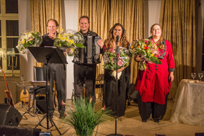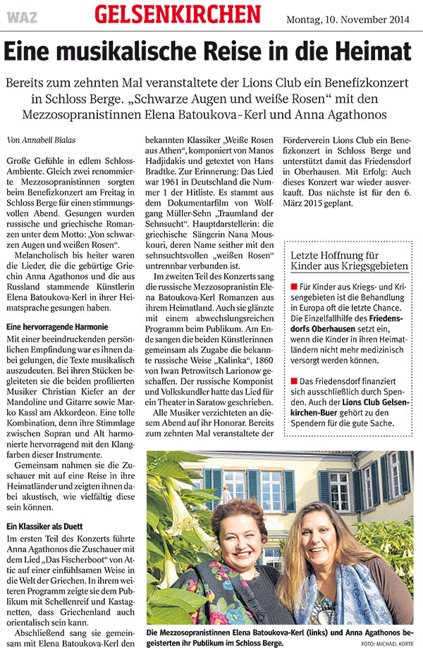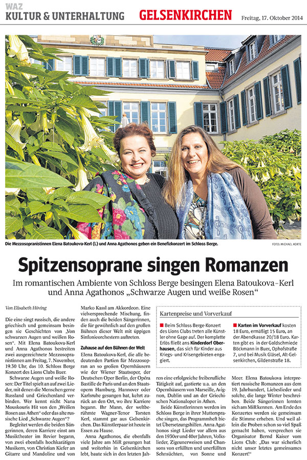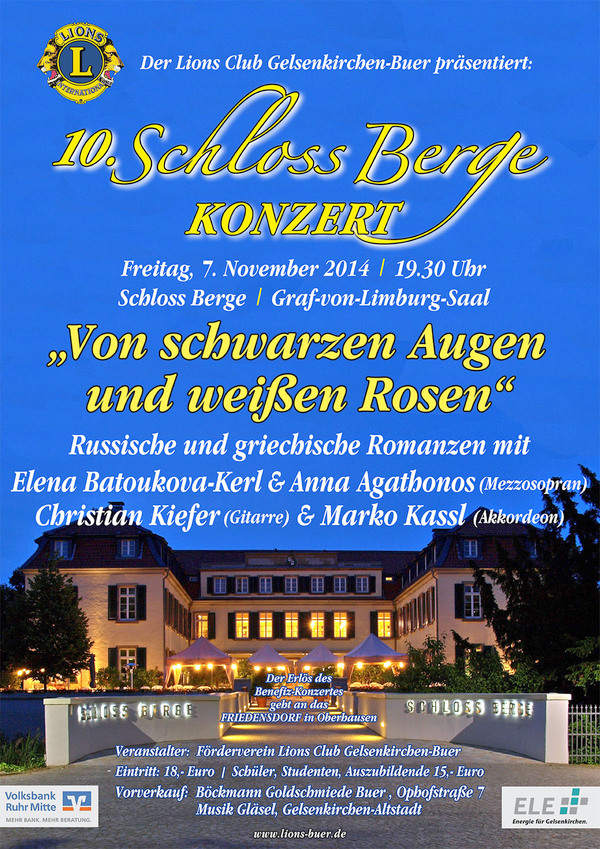 Das 10. Schloss Berge-Konzert des Lions Clubs Gelsenkirchen-Buer fand am 7. November 2014, 19.30 Uhr, unter dem vielversprechenden Motto "Von schwarzen Augen und weißen Rosen" statt. In Anlehnung an die berühmten Lieder "Schwarze Augen" und "Weiße Rosen aus Athen" sangen die griechische Mezzosopranistin Anna Agathonos und die russische Mezzosopranistin Elena Batoukova-Kerl russische und griechische Romanzen. Begleitet wurden sie dabei von zwei profilierten Solisten, Christian Kiefer an der Gitarre und Marko Kassl am Akkordeon. Mit ihren Instrumenten sorgten sie für den zum Thema der Lieder passenden Sound. Die beiden Mezzosopranistinnen, die ein Engagement am Musiktheater im Revier hatten, haben sich längst über Gelsenkirchen hinaus einen Namen gemacht. Anna Agathonos gastierte u.a. an den Opernhäusern in Marseille, Avignon, Dublin und an der Griechischen Nationaloper in Athen, Elena Batoukova-Kerl hat alle bedeutenden Partien für Mezzosopran an so großen Opernhäusern wie der Wiener Staatsoper, der Deutschen Oper Berlin, der Opéra Bastille de Paris und an den Staatsopern Hamburg, Hannover, Karlsruhe u.a.m. gesungen. Beide Künstlerinnen können auf eine rege Konzerttätigkeit und die Mitwirkung bei großen Festivals verweisen.