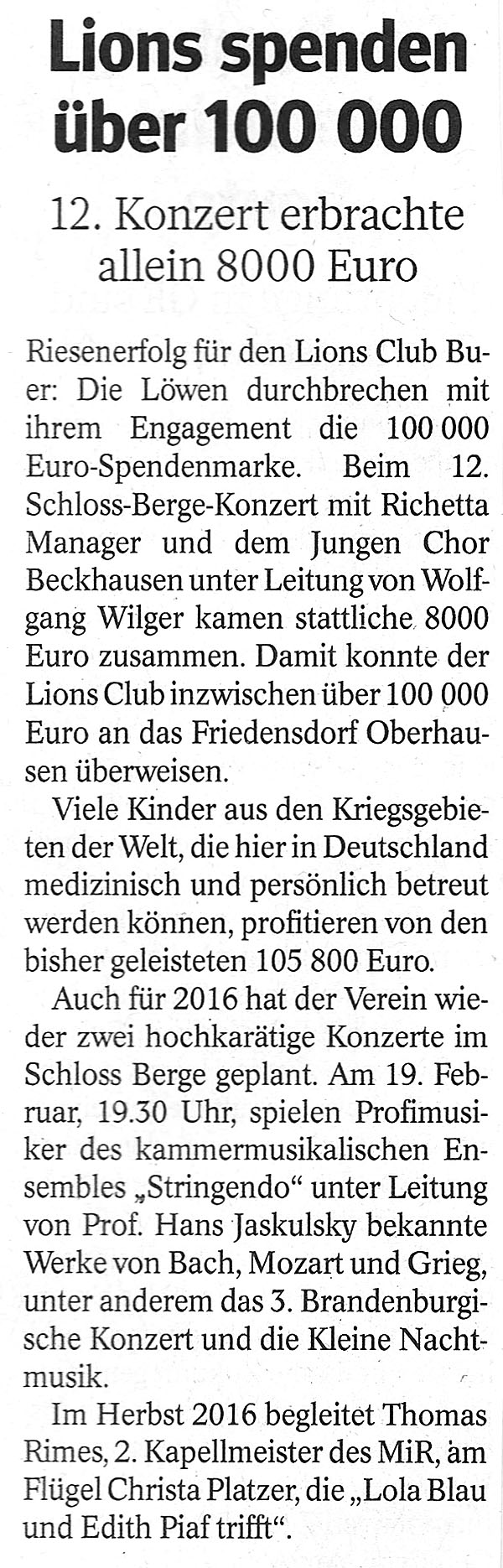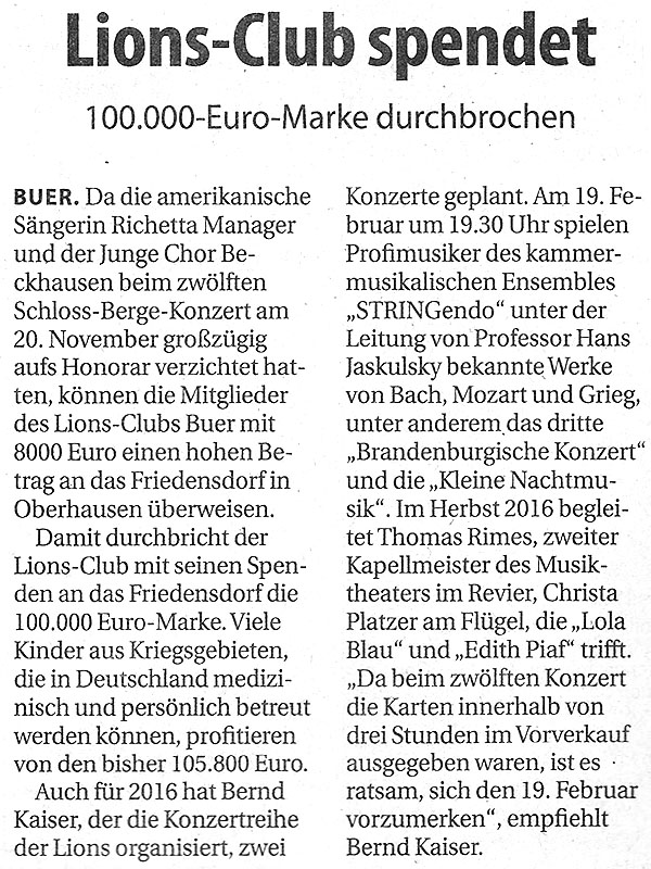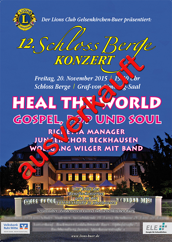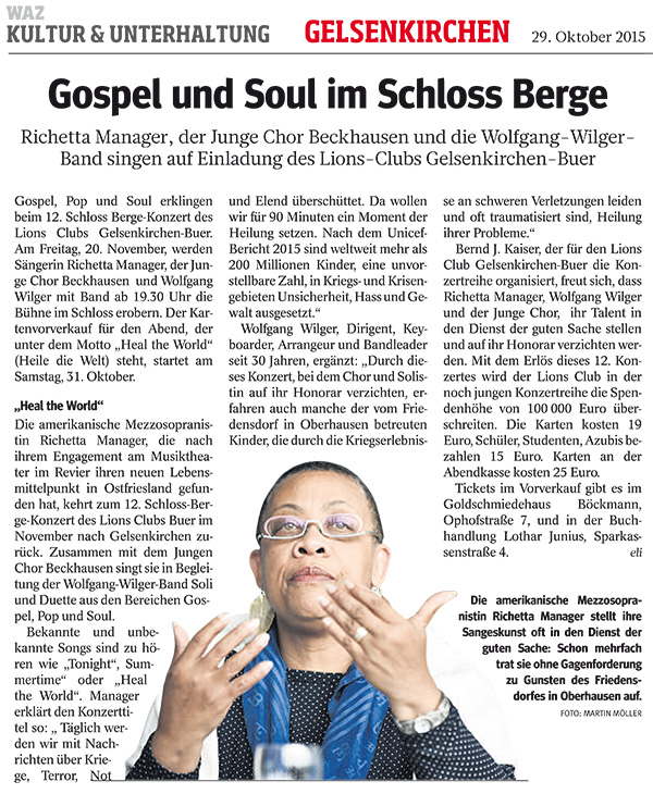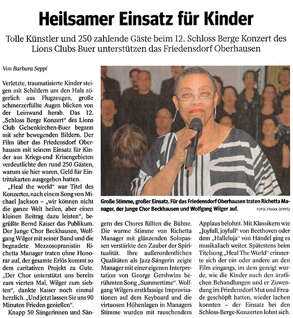 Beim 12. Schloss Berge-Konzert des Lions Clubs Gelsenkirchen-Buer am 20. November 2015 um 19.30 Uhr sang die amerikanische Mezzosopranistin Richetta Manager, die viele Jahre im Musiktheater im Revier gearbeitet hat, zusammen mit dem Jungen Chor Beckhausen bekannte und neue Soli und Duette aus den Bereichen Gospel, Pop und Soul. „Heal the world“ hieß der Titel, und so wollten die Mitwirkenden für 90 Minuten mit ihrem Gesang ein wenig Heilung in eine Zeit bringen, die von schrecklichen Nachrichten über Kriege, Unruhen und Terror weitgehend bestimmt ist. Heilung erfahren auch manche der vom Friedensdorf betreuten schwerverletzten Kinder, da Chor und Solistin auf ihr Honorar verzichten. Wie bei allen Schloss-Berge-Konzerten überweist der Förderverein des Lions Clubs Gelsenkirchen-Buer den gesamten Erlös ohne Abzug an das Friedensdorf. Mit diesem Konzert wird der Club die 100.000,00 €-Grenze an Spenden für die vom Friedensdorf betreuten Kinder deutlich überschreiten. Wolfgang Wilger leitet mit gewohntem musikalischem Elan das Ensemble, unterstützt von seiner Band.