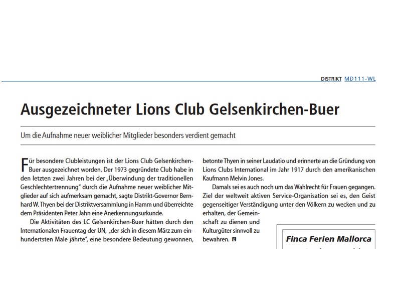 Für besondere Clubleistungen ist der Lions Club Gelsenkirchen-Buer ausgezeichnet worden. Der 1973 gegründete Club habe in den letzten zwei Jahren bei der „Überwindung der traditionellen Geschlechtertrennung“ durch die Aufnahme neuer weiblicher Mitglieder auf sich aufmerksam gemacht, sagte Distrikt-Governor Bernhard W. Thyen bei der Distriktversammlung in Hamm und überreichte dem Präsidenten Peter Jahn eine Anerkennungsurkunde.