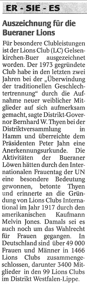 Für besondere Clubleistungen ist der Lions Club (LC) Gelsenkirchen-Buer ausgezeichnet worden. Der 1973 gegründete Club habe in den letzten zwei Jahren bei der "Überwindung der traditionellen Geschlechtertrennung" durch die Aufnahme weiblicher Mitglieder auf sich aufmerksam gemacht, sagte Distrikt-Governor Bernhard W. Thyen bei der Distriktversammlung in Hamm und überreichte dem Präsidenten Peter Jahn eine Anerkennungsurkunde. Die Aktivitäten der Bueraner Löwen hätten durch den internationalen Frauentag der UN eine besondere Bedeutung gewonnen, betonte Thyen und erinnerte an die Gründung von Lions Clubs International im Jahr 1917 durch den amerikanischen Kaufmann Melvin Jones. Damals sei es auch noch um das Wahlrecht für Frauen gegangen. In Deutschland sind über 49000 Frauen und Männer in 1466 Lions Clubs zusammengeschlossen, darunter 3400 Mitglieder in 99 Clubs im Distrikt Westfalen-Lippe.