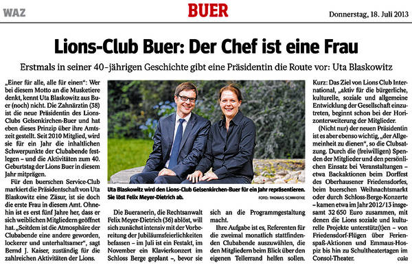„Einer für alle, alle für einen“: Wer bei diesem Motto an die Musketiere denkt, kennt Uta Blaskowitz aus Buer (noch) nicht. Die Zahnärztin (38) ist die neue Präsidentin des Lions- Clubs Gelsenkirchen-Buer und hat eben dieses Prinzip über ihre Amtszeit gestellt. Seit 2010 Mitglied, wird sie für ein Jahr die inhaltlichen Schwerpunkte der Clubabende festlegen – und die Aktivitäten zum 40. Geburtstag der Lions Buer in diesem Jahr mitprägen.