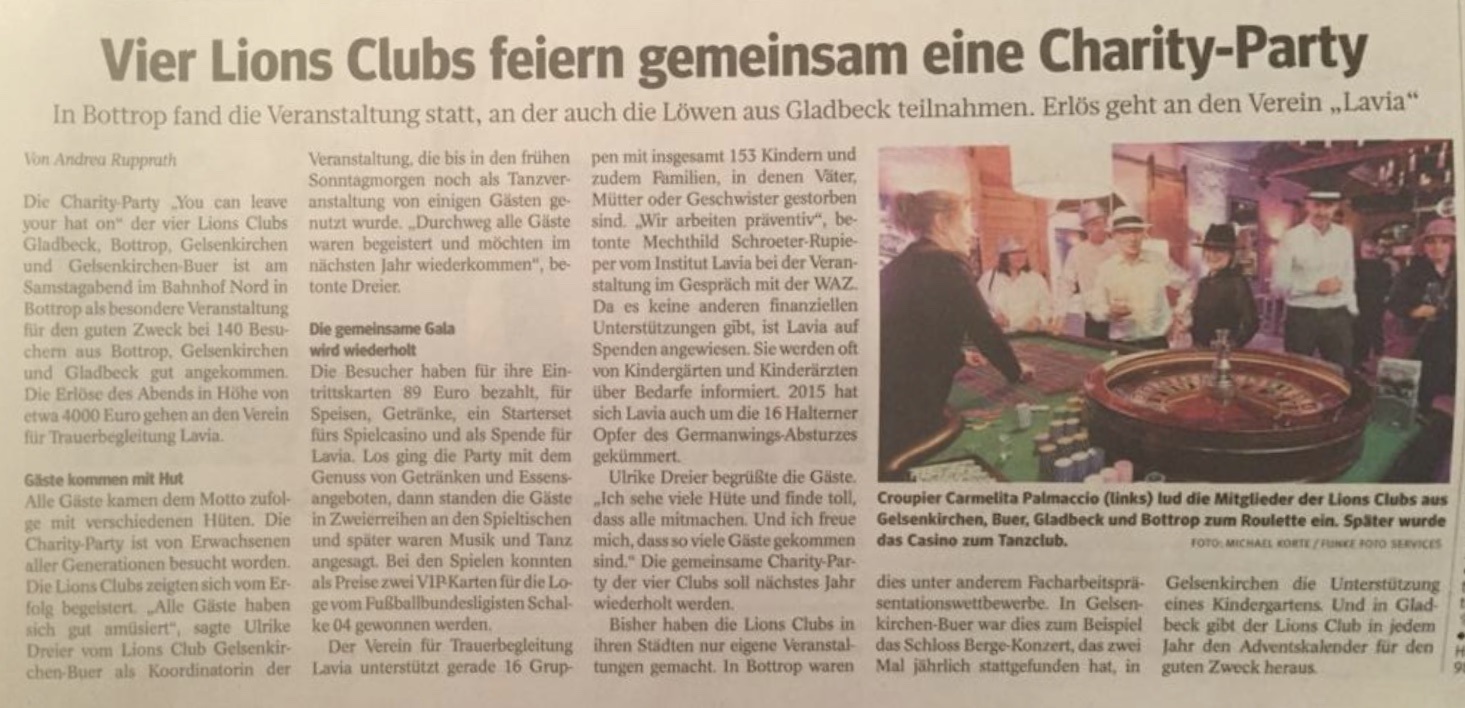 Die Erlöse dieses Abends gingen zu 100% zu Gunsten von Lavia e.V. - Verein für "Trauerbegleitung", eine ganz neue Form der Trauerbegleitung für Kinder, Jugendliche und ihre Eltern. Mehr zur Arbeit von Lavia finden Sie unter folgenden Link.